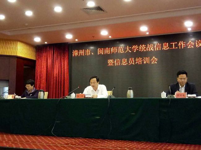 4月27日,漳州市、闽南师大2017年统战信息工作会议暨信息员培训会在芗江酒店翠竹园四楼会议厅举行。会议由我校统战部与漳州市委统战部共同举办。我校统战部全体成员、各民主党派骨干成员,市直统战系统各单位、市各县(市、区)委统战部分管领导及信息员,漳州市统战特约信息员共120多人参加了会议。漳州市委统战部副部长林青出席会议并讲话,会议由市委统战部部务会成员、调研员黄文龙主持。