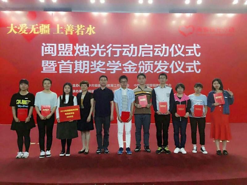 5月19日上午,由中共福建省委教育工作委员会、中国民主同盟福建省委员会主办的大爱无疆、上善若水“闽盟烛光行动”启动暨首期奖学金颁发仪式在福建师范大学旗山校区图书馆学术大讲堂举行。民盟中央副主席、民盟福建省委主委、省政协副主席郑兰荪,省教育厅副厅长陈国龙,民盟中央社会服务部有关领导,民盟福建省委会领导、首批爱心企业代表、爱心社会组织代表、乡村教师代表、全体获奖学生以及民盟省直基层部分盟员共计200余人参加了此次活动。活动为我省9所高校100名获资助学生现场颁发了奖学金,这标志着“闽盟烛光行动”正式启动。我校杨晶芯、吴若凡、沈加煜、周子桓、魏婕、钟翎心、苏建霖、江思涵、刘宇捷等9名学生获得了此次活动资助。
