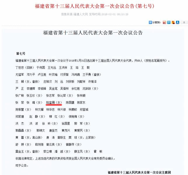 2018年1月31日下午,福建省第十三届人民代表大会第一次会议选举产生69名第十三届全国人民代表大会代表。我校十二、十三届漳州市政协委员、民盟漳州市委会副主委、我校民盟总支主委、生物科学与技术学院副院长陆銮眉教授光荣当选第十三届全国人民代表大会代表。