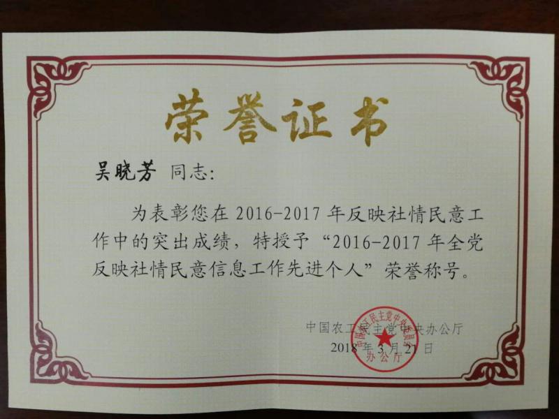 在刚刚闭幕的农工党2018全国党务工作会议上,我校农工党党员——闽南文化研究院&两岸一家亲研究院吴晓芳教授获农工党中央表彰,获“2016-2017年全党反映社情民意信息工作先进个人”荣誉称号。
