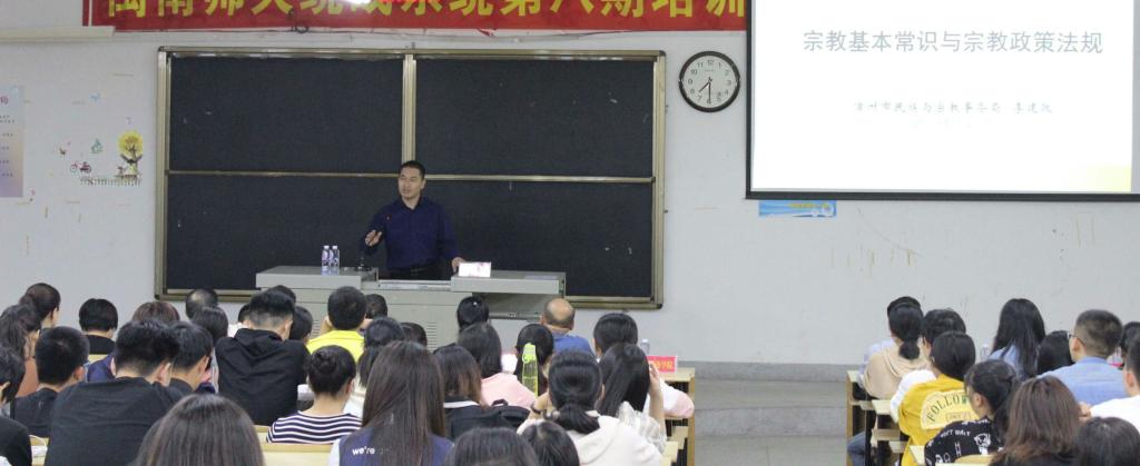 10月18日,我校统战部联合学生处、保卫处在笃行楼223举行“宗教政策和宗教知识”宣讲活动。活动邀请漳州市民宗局宗教科科长李建政主讲,全校师生共300多人参加。活动由校党委统战部长欧阳红红主持。