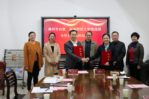 12月16日下午,我校统战部与漳州市台湾同胞联谊会合作共建签约仪式在科技楼会议室举行。我校统战部部长徐志怀,市台联党组书记林百荣,市台联会长方丽云出席签约仪式,校宣传部、统战部和市台联相关人员参加签约仪式。签约仪式由校统战部副部长张媛主持。