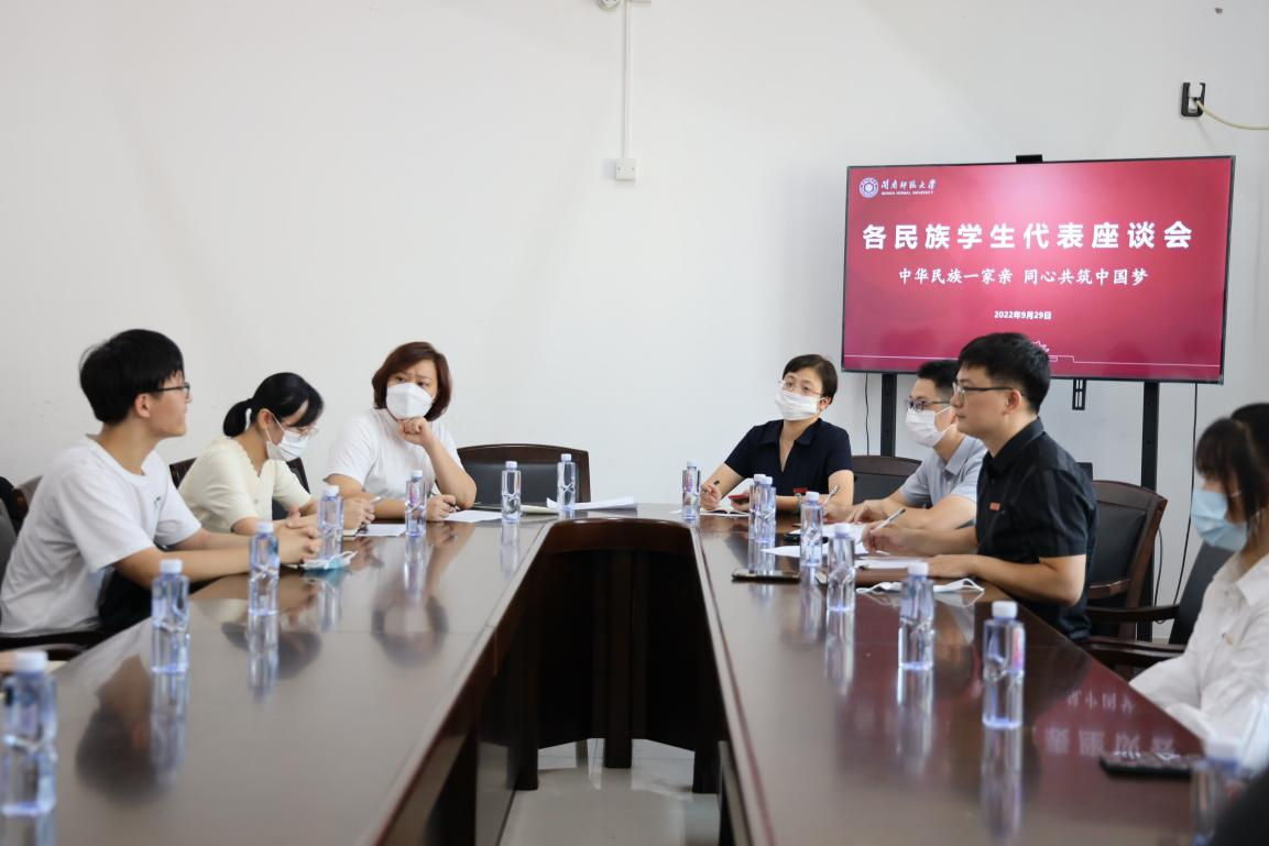 为贯彻落实中央统战工作会议精神,深化民族团结进步教育工作,以实际行动迎接党的二十大召开,近日,我校在科技楼北1209召开“中华民族一家亲 同心共筑中国梦”少数民族学生代表座谈会。校党委宣传部、统战部副部长张媛、学生处副处长陈明,学生处、保卫处、后勤管理处相关科室负责人以及来自各学院31名少数民族学生代表参加会议。