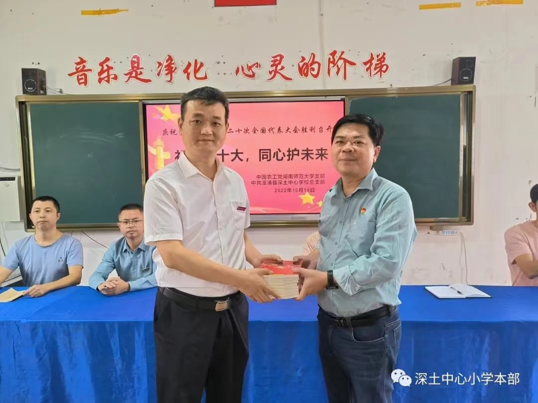 近日,农工党闽南师大支部前往漳浦县深土镇,与漳浦县深土中心小学联合开展“礼赞二十大,同心护未来”主题教育活动。农工党闽南师大支部主任陈春华、副主任委员苏祖鹏,深土中心小学党总支书记周文华参加活动。