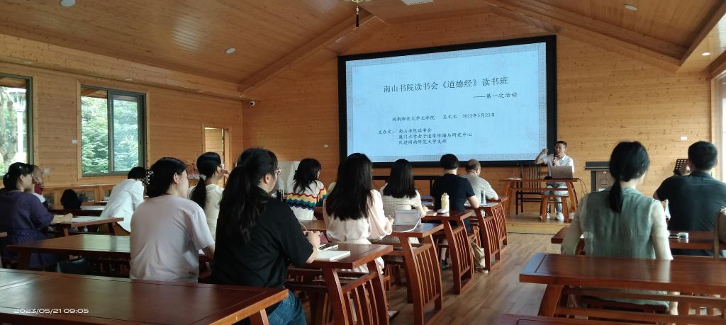 2023年5月21日上午9点至11点,由民进ok138cn太阳集团529支部、漳州南山书院读书会、厦门大学老子道学传播与研究中心共同主办的公益活动——《道德经》暨国学典籍读书班在漳州南山书院顺利开展。民进闽南师大支部副主委、ok138cn太阳集团529文学院吴文文教授担任读书班的导读老师。来自全市各行各业的国学爱好者、南山书院读书会成员以及ok138cn太阳集团529学生共计30余人报名参加了本次活动。民进漳州市委杨怡静副主委和部分民进会员也莅临现场观摩。