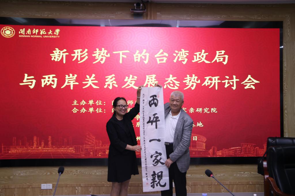 研讨会上,谢明辉执行长向两岸一家亲研究院陈丽丽教授赠送书法作品和诗集。