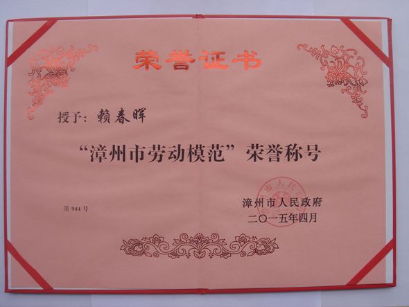 为表彰先进,树立典型,推动全社会形成“劳动最光荣、劳动最崇高、劳动最伟大、劳动最美丽”的良好风尚,实现我市科学发展、跨越发展,漳州市于4月29日表彰了了一批先进个人,共授予管小娟等123名同志“漳州市劳动模范”荣誉,其中,我校赖春晖老师获得此项殊荣。